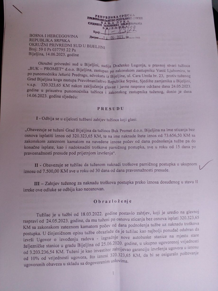 U obrazloženju presude, koja je u posjedu portala „Bijeljina.com“, navedeno je da je  odbijen tužbeni zahtjev preduzeća „Buk – promet“ koje je od grada Bijeljina, na ime sticanja bez osnova, tražilo da im se isplati 320.323 KM, sa zakonskom zateznom kamatom, te da se na ime nadoknade štete isplati iznos od 73.656 KM na ime izgubljene dobiti.