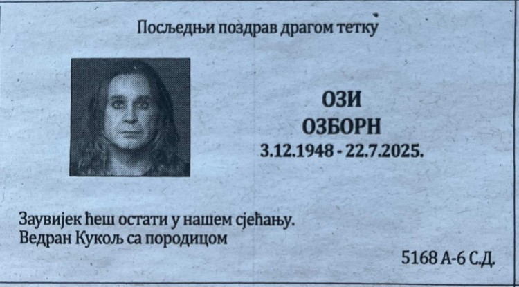 Vedran Kukolj, profesionalni vozač iz Banjaluke, odlučio je da se čituljom oprosti od legendarne zvijezde hevi metala Ozija Ozborna, koji je preminuo u 76. godini.