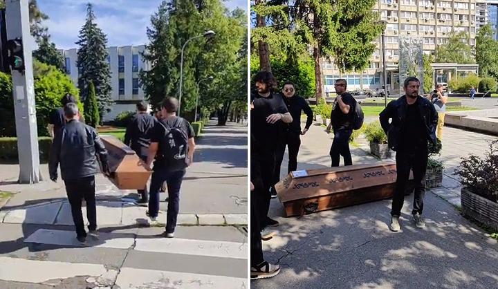Demonstranti su donijeli mrtvački sanduk koji treba da simbolizuje “smrt demokratije” u Republici Srpskoj.
