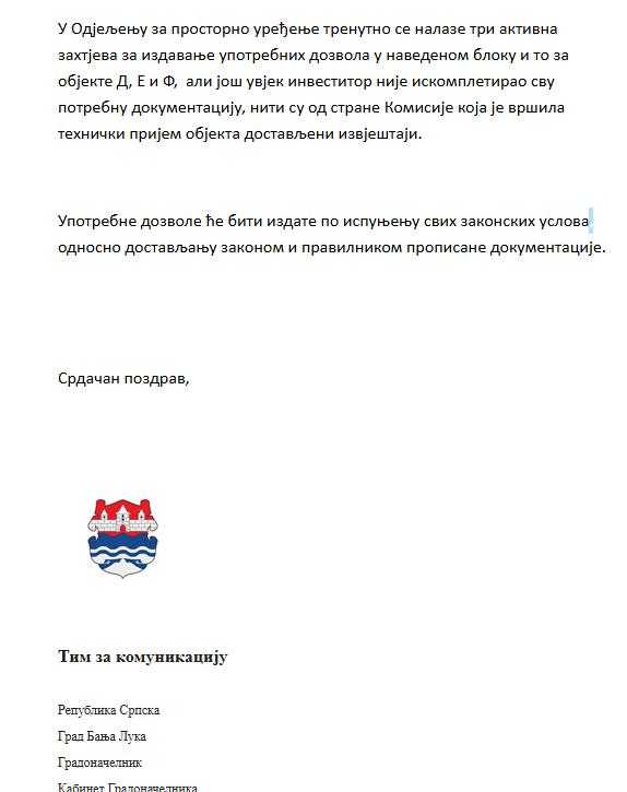 Iz Gradske uprave za naš portal su potvrdili da se u Odjeljenju za prostorno uređenje trenutno nalaze tri aktivna zahtjeva za izdavanje upotrebnih dozvola u navedenom bloku, i to za objekte D, E i F.