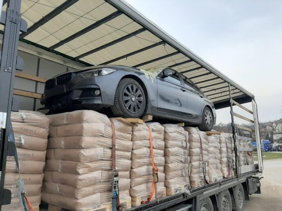 Nakon što je sa vozila uklonjena cerada, u tovaru je pored prijavljene robe uočen i BMW bez registarskih oznaka za čiji utovar je bilo potrebno angažovati viljuškar, a potom ga i dobro obezbjediti da se ne bi pomjerao tokom vožnje.