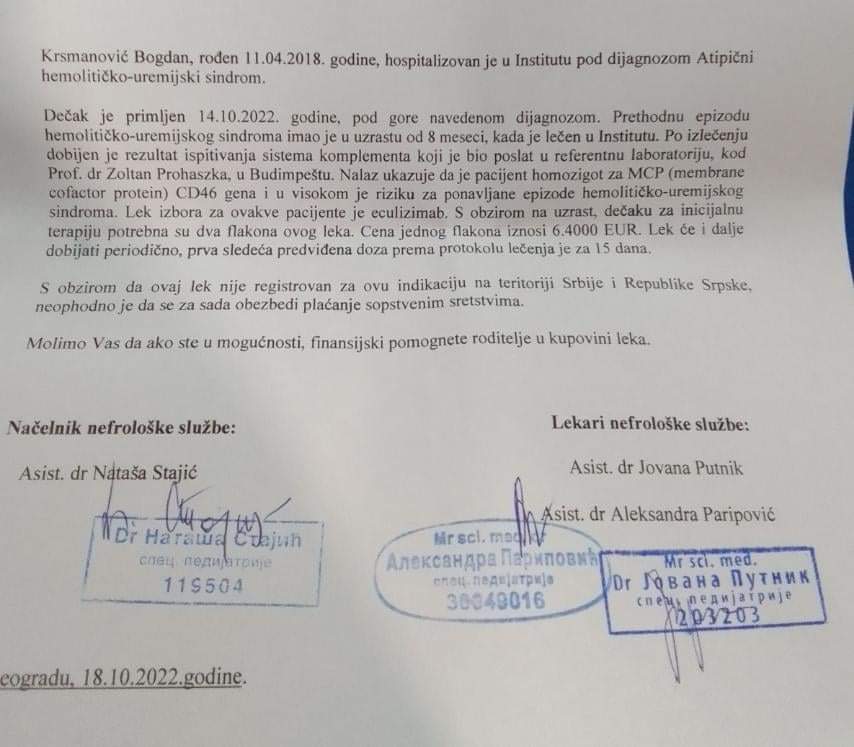 Bogdan ima veoma rijetku bakteriju koja mu zaustavlja rad vitalnih organa. Postoji samo jedan lijek, ampula koja košta 6.400,00 €.