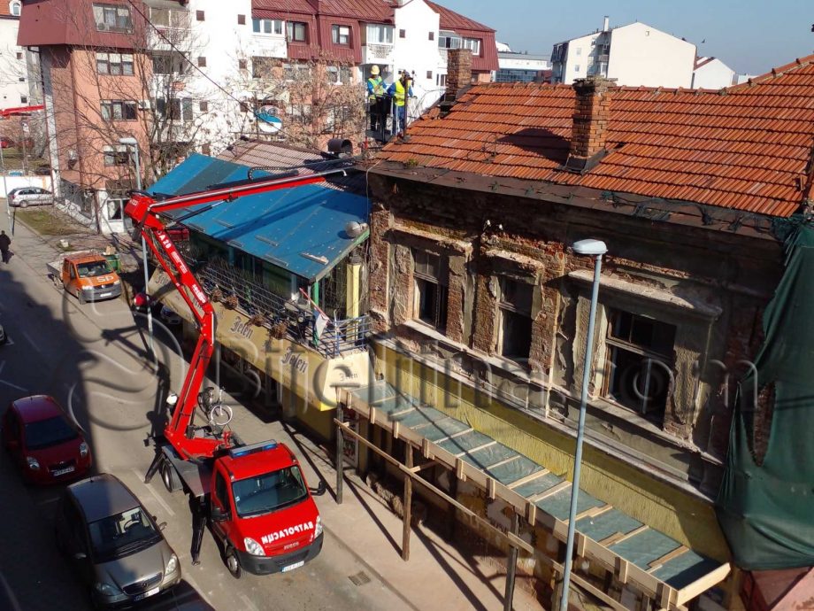 Kako bi zaštitili prolaznike i automobile od komada cigle i maltera koji otpada sa ruiniranog objekta u centru grada, i bijeljinski vatrogasci su priskočili u pomoć.