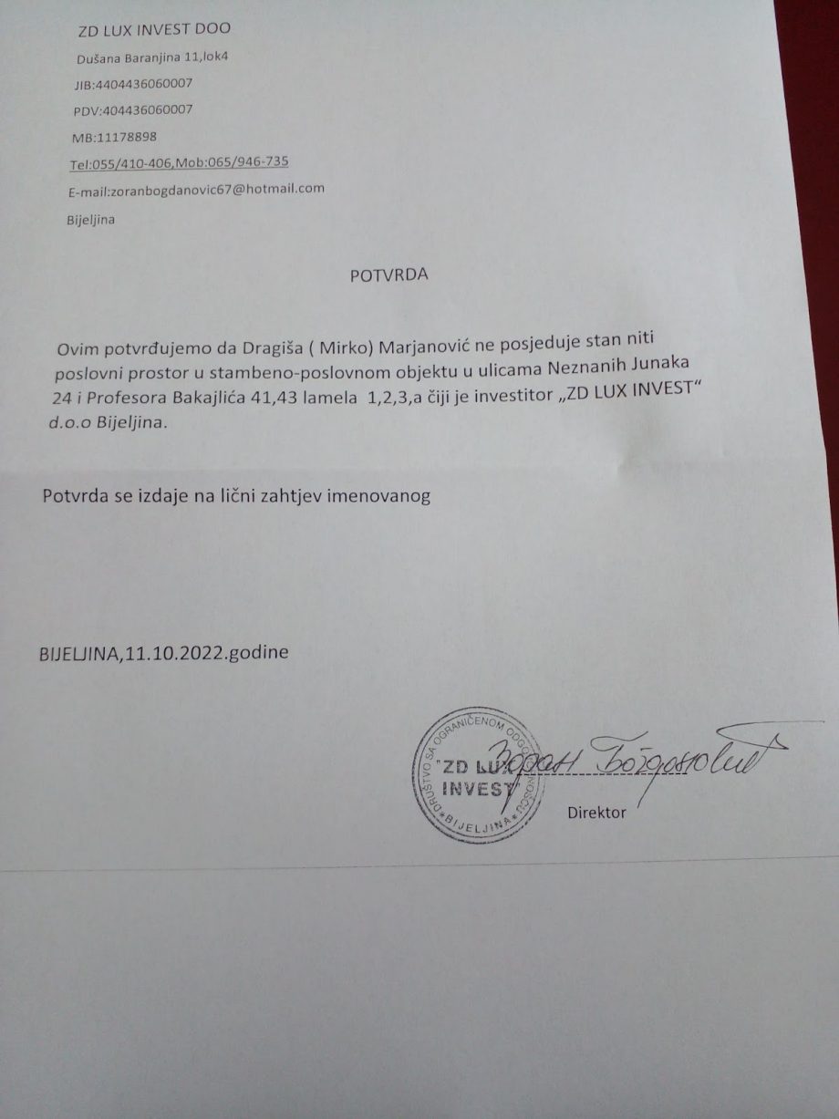 “Gradonačelnik je juče iznio niz neistina i na taj način prozvao je mene i moju porodicu. Doveo nas je u vezu sa famoznom aferom kupovine nekretnina, na jedan sumnjiv način, na adresama u Ulici neznanih junaka i Profesora Bakajlića. Želim da obavijestim javnost da je gradonačelnik Petrović iznio niz neistina na jučerašnjoj konferenciji za štampu. Pripremio sam i potvrdu investitora ”ZD Lux Invest” da “Dragiša Marjanović na adresi u Ulici neznanih junaka 24 i Profesora Bakajlića broj 41 , 43, lamele 1, 2 i 3, ne posjeduje stambeni, niti poslovni prostor”. Sada pitam, kao građanin ovog grada, zbog čega je Ljubiša Petrović, kao gradonačelnik, devalvirao sebe lično i gradonačelničku funkciju. Pitam se, bilo šta sutra da gradonačelnik Petrović iznese u javnost, duboko bih se zamislio i zapitao, da li taj čovjek govori istinu”, izjavio je Marjanović, naglasivši da je osjećao moralnu obavezu da informiše javnost o tome da on ne posjeduje niti stan, niti poslovni prostor na pomenutim adresama.