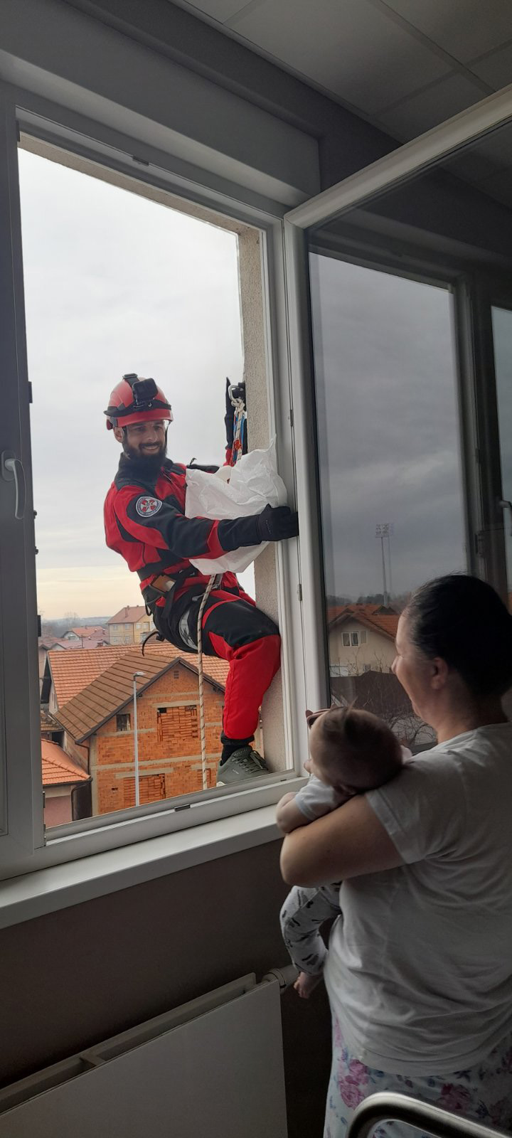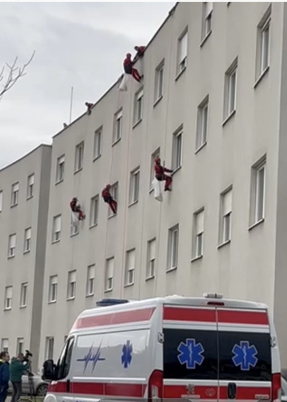 Djeci hospitalizovanoj na Odjeljenju pedijatrije bijeljinske Bolnice “Sveti vračevi” danas su Djeda Mrazevi na neobičan način donijeli poklone – spuštajući se do prozora sa krova zgrade.