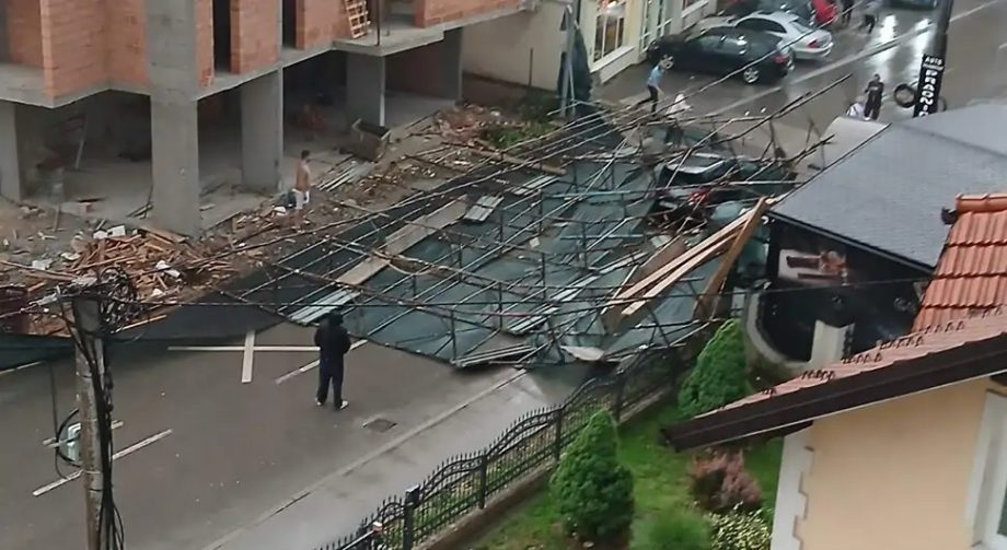 Sa jednog gradilišta u Doboju jak vjetar oborio je skelu na putničko vozilo i u toku je izvlačenje lica iz automobila, izjavio je starješina Teritorijalne vatrogasno-spasilačke jedinice Branko Miletić.
