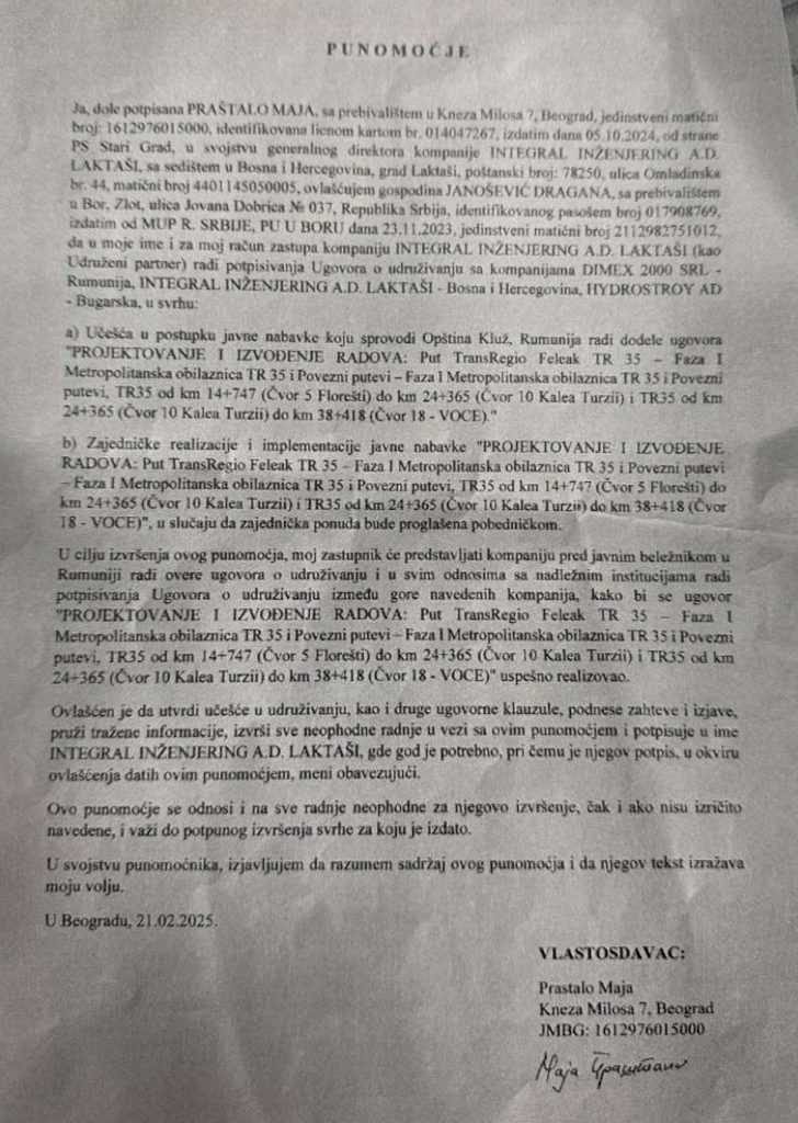 “Još u septembru smo obavijestili opštinu Kluž da Integral inženjering nije učesnik tendera u Rumuniji, a oni su nam poslali dokumente koja su navodno dostavljena iz naše firme. U tim dokumentima je falsifikovan moj srpski pasoš, kao i ovlaštenje koje sam navodno potpisala Janoševiću kod notara i ovlastila ga da nas zastupa“, objašnjava Praštalo za CAPITAL.