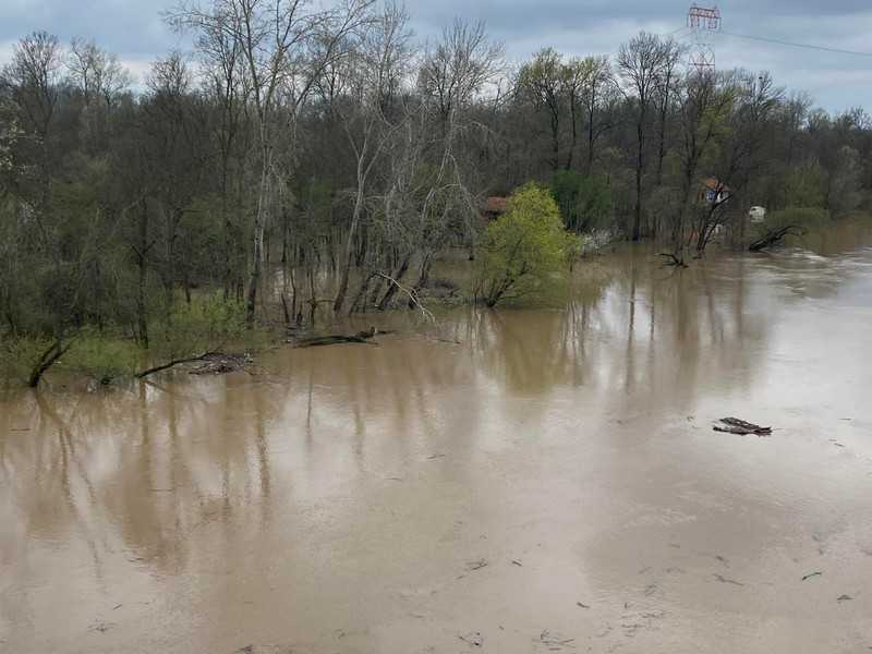Rijeka nosi granje i mulj, a vodostaj je poprilično visok.