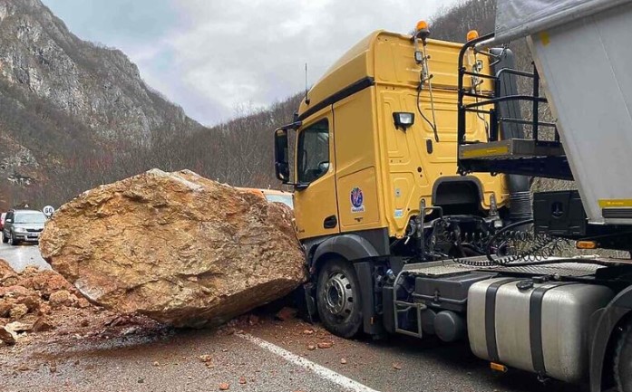 Kako su potvrdili iz MUP-a Republike Srpske, jutros oko 8 sati na putu Miljevina-Dobro polje u mjestu Tuhalji koje se nalazi u opštini Foča stijena je pala na magistralni put i udarila u teretno motorno vozilo.