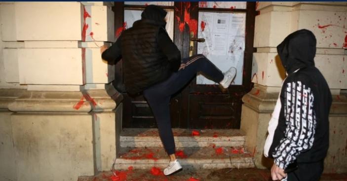 Učesnici večerašnjeg protesta opozicije u Novom Sadu razbili su večeras stakla na vratima i prozorima Gradske kuće u Novom Sadu, polili zgradu fekalijama i gađali je crvenom farbom i kamenicama.