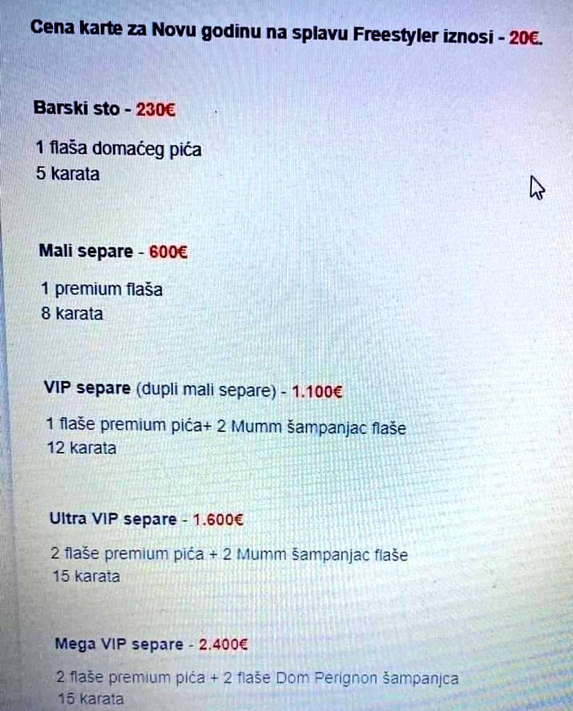 Prema reklami za doček Nove godine 2023. u ovom klubu, cijena karte za noć je išla od 27 do 40 evra pa do nevjerovantnih 1.000 evra, koliko je iznosila doplata za takozvani “Freestyler separe” sa 6 premium flaša pića po izboru.