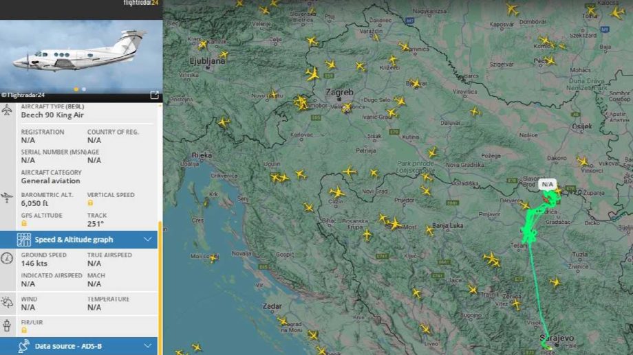 Specijalizovani avion za nadzor i kontrolu Beech 90 King Air nadlijeće iznad teritorije Doboja i Modriče.
