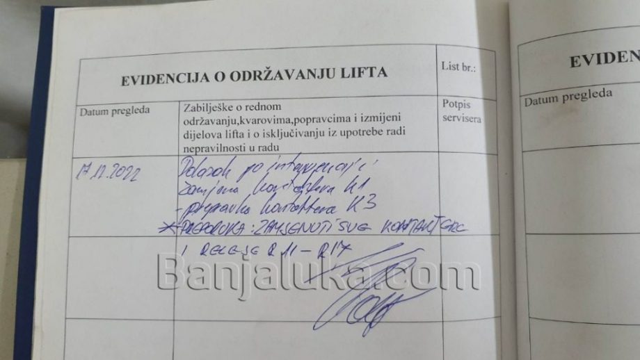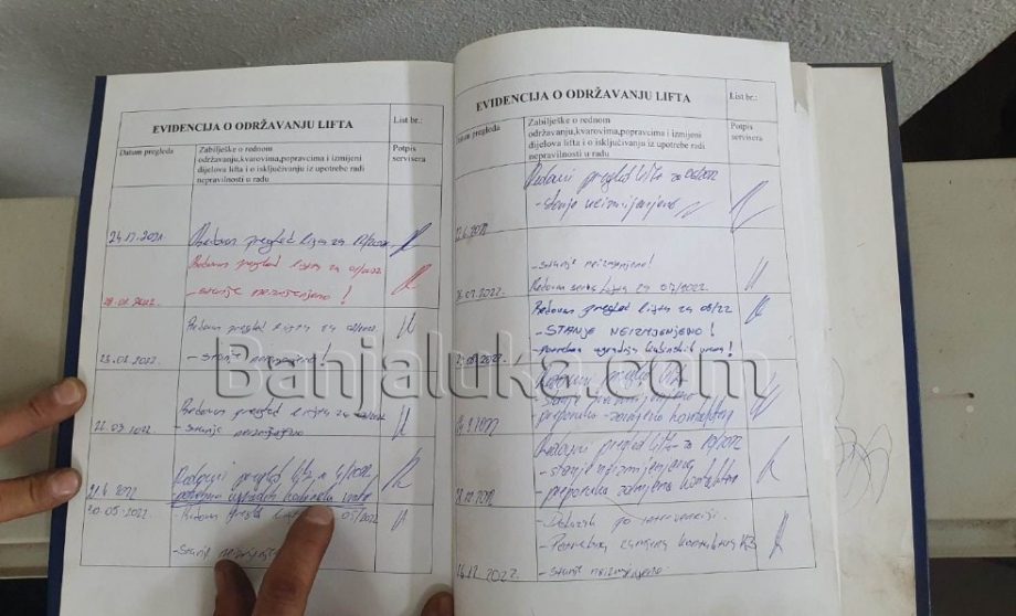 Banjaluka.com je u posjedu fotografija knjige evidencija o održavanju lifta, koje možete pogledati u nastavku.