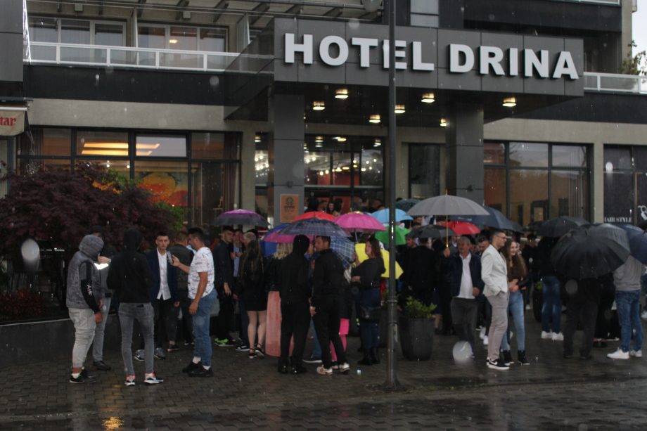 Maturanti Srednje stručne škole iz Janje proslavili su večeras matursko veče direktnim okupljanjem ispred hotela “Drina”, zbog obilne kiše koja je u popodnevnim satima zahvatila Bijeljinu.