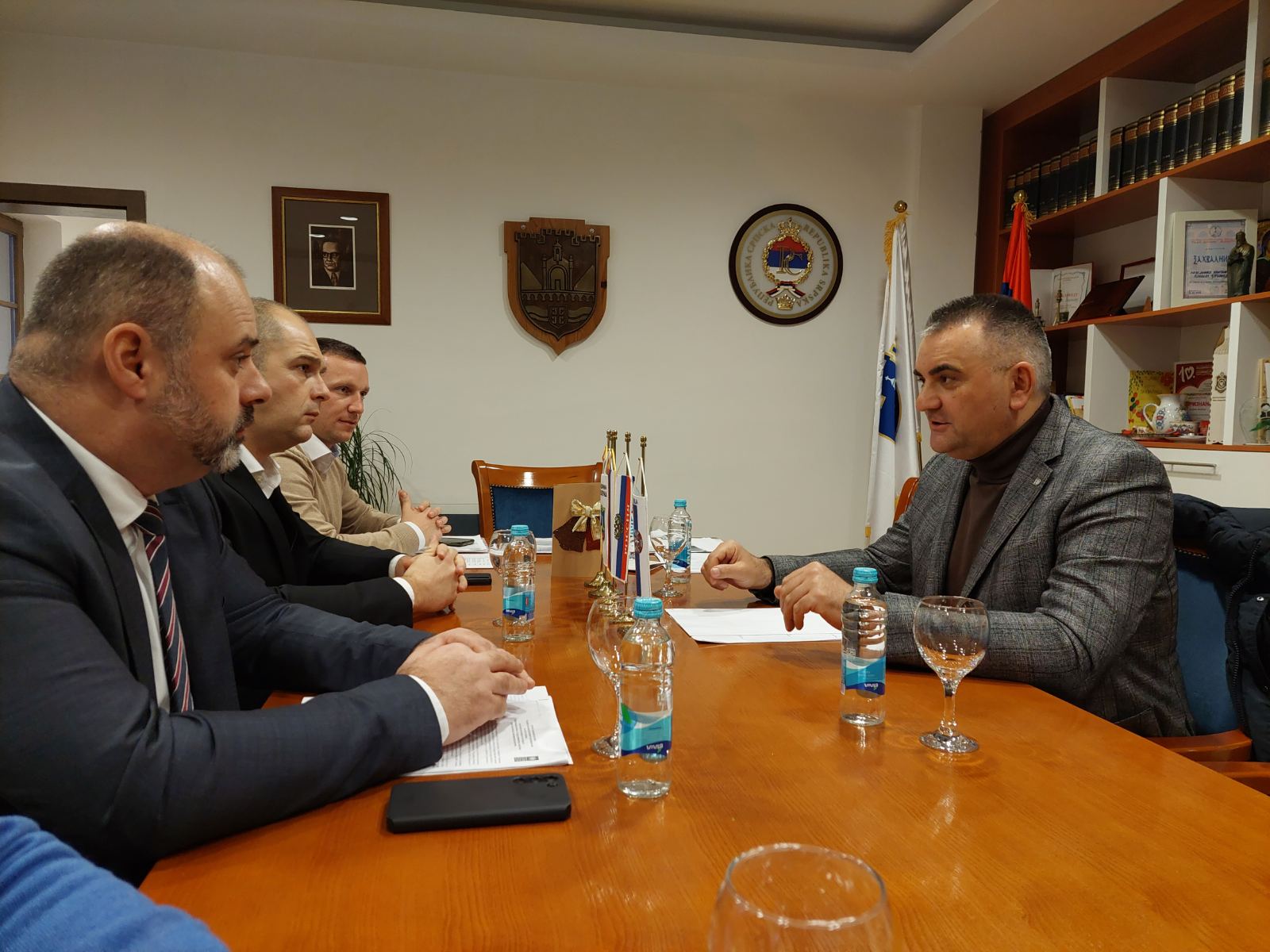 Ministar poljoprivrede, šumarstva i vodoprivrede Republike Srpske Savo Minić u Višegradu razgovara sa načelnikom opštine Višegrad Mladenom Đurevićem, o stanju u opštini nakon obilnih padavina i rasta vodostaja rijeka u slivu Drine.