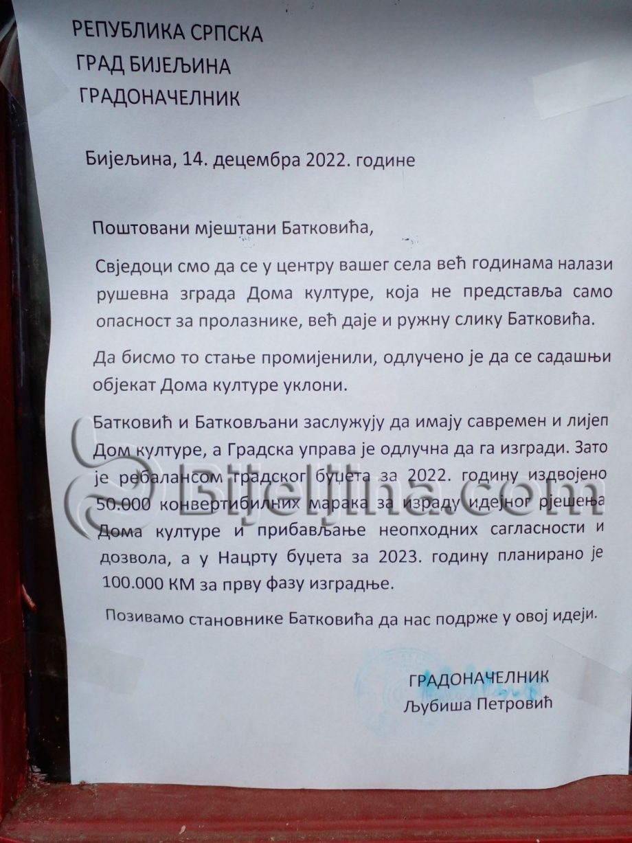 „Batković i Batkovljani zaslužuju da imaju savremen Dom kulture, a Gradska uprava je odlučna da ga izgradi. Zato je rebalasom budžeta za 2022. godinu izdvojeno 50.000 KM za izradu idejnog rješenja Doma kulture i pribavljanje neophodnih saglasnosti i dozvola, a u Nacrtu budžeta za 2023. godinu planirano je 100.000 KM za prvu fazu izgradnje novog Doma kulture“, navedeno je u obavještenju koje je potpisao gradonačelnik Ljubiša Petrović.