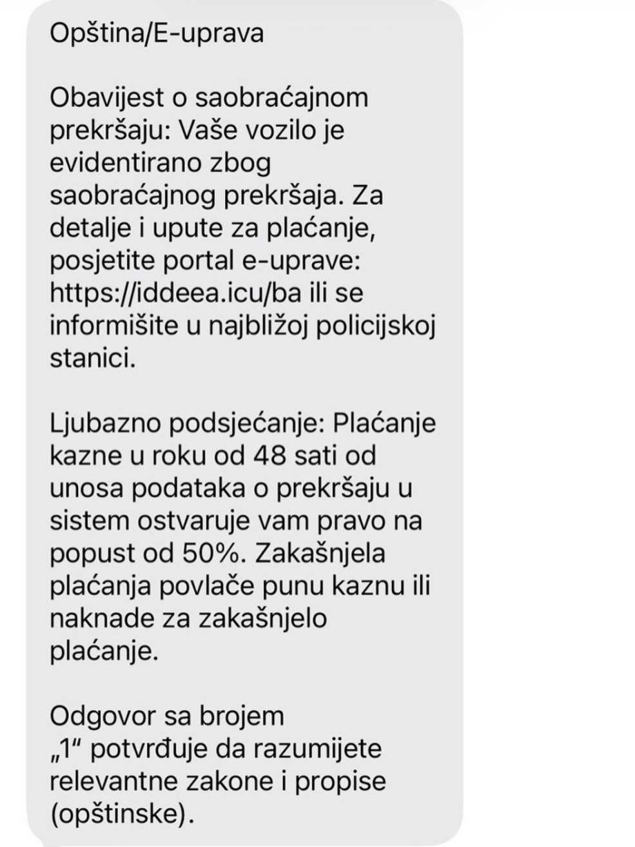 U porukama se navodno navode neizmirene saobraćajne kazne, uz poziv građanima da putem priloženih linkova izvrše provjeru ili uplatu, uz korištenje naziva IDDEEA BiH.