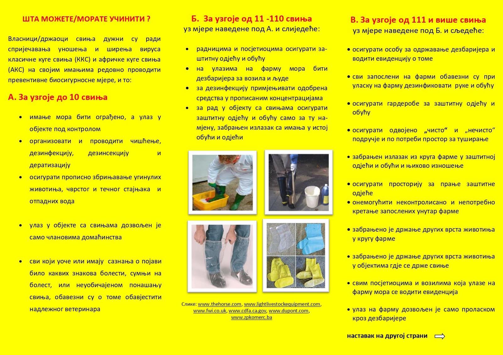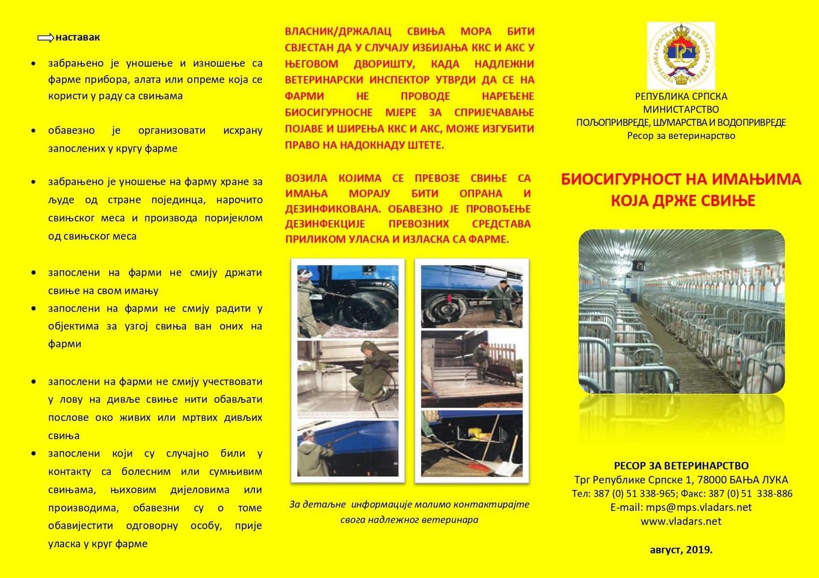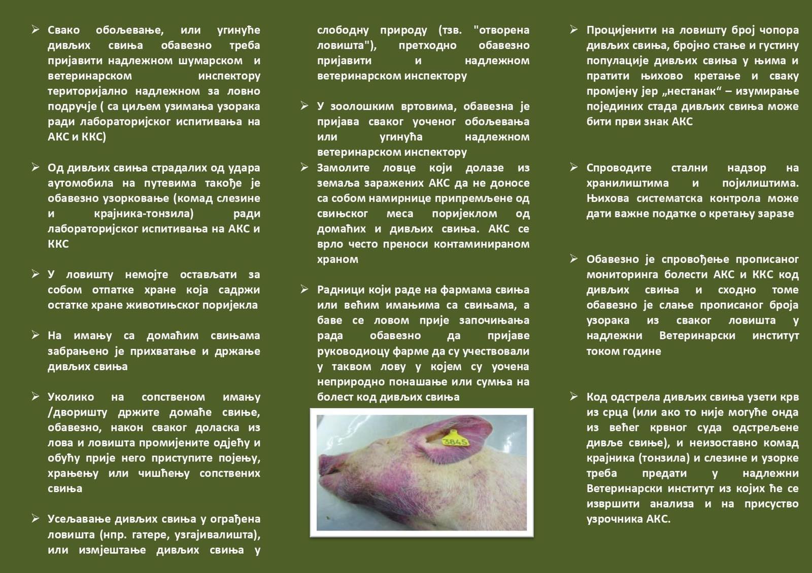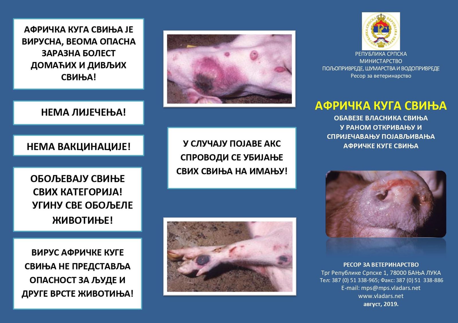 Ministarstvo poljoprivrede, šumarstva i voodprivrede Republike Srpske obavještava da je skladu sa novonastalom epizootiološkom situacijom i pojavom afričke kuge svinja u Republici Srpskoj, na snazi provođenje mjera suzbijanja i sprečavanja širenja bolesti u zaraženom i ugoženom području.