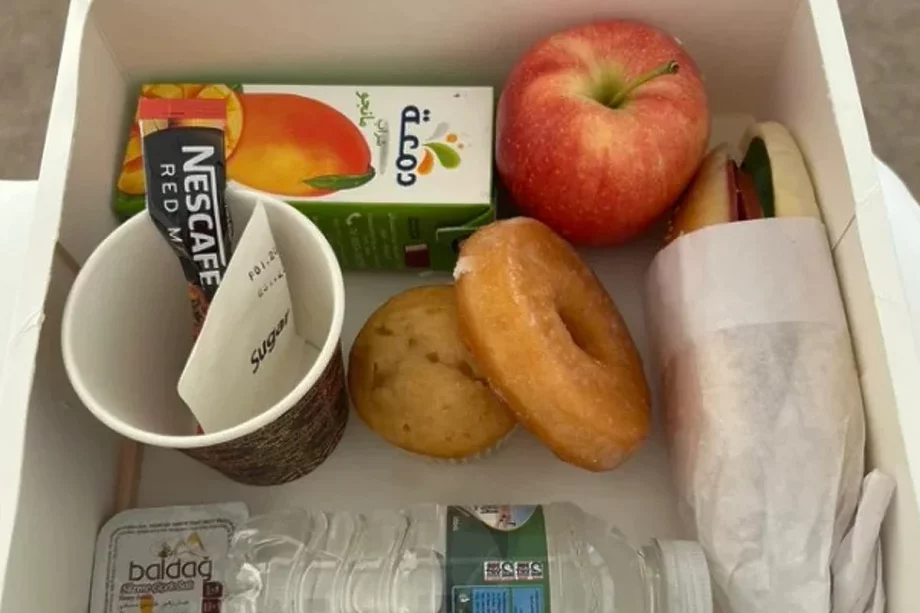 Kutija za doručak sadrži sendvič, jabuku, mafin i krofnu. Također, u kutiji se još nalazi sok, mala flaša vode i vrećica instant kafe u papirnoj šolji, kao i malo pakovanje meda.