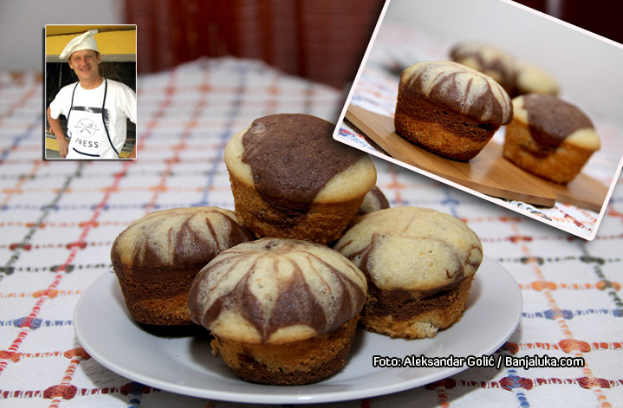 Ovim smjesama naizmjenično puniti kalupe za mafine do 2/3 do vrha, jer treba im ostaviti prostora da narastu. Čačkalicom zatim prošarati kao da miješate po kalupima kako bi dobili šare.