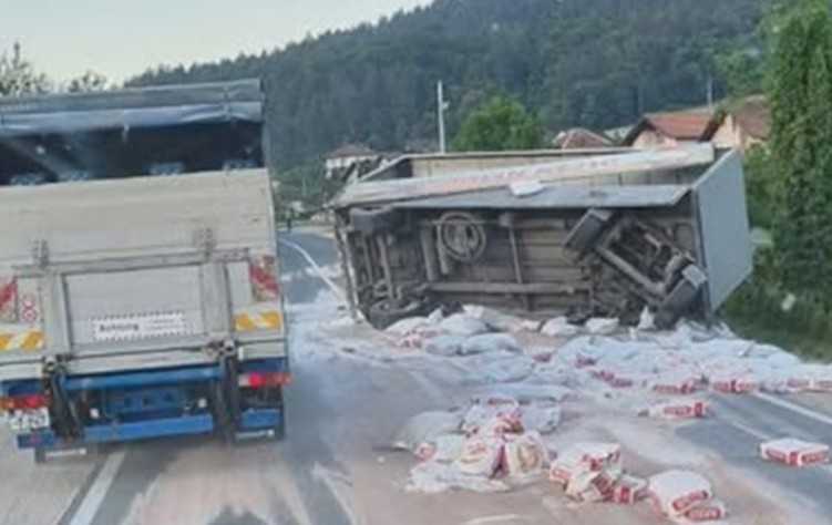 Prema prvim informacijama, kamion se iz za sada neutvrđenih razloga prevrnuo u krivini, a stotine kilograma brašna iz vozila završile su po kolovozu, otežavajući dodatno uslove vožnje.