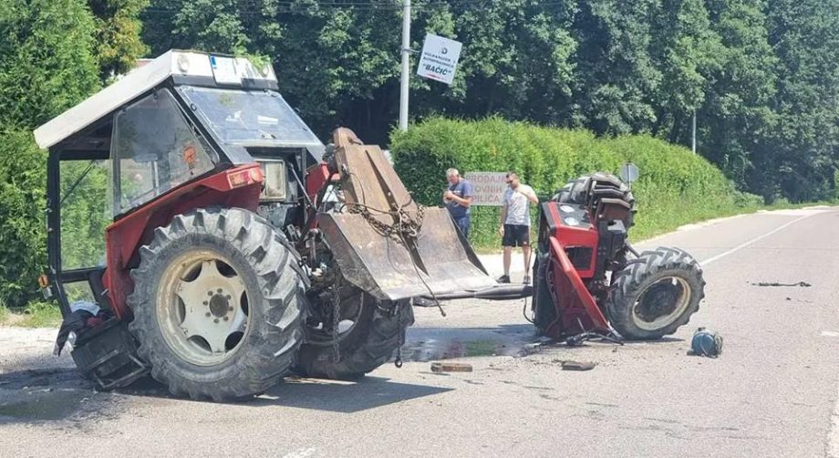 Saobraćajna nezgoda dogodila se na izlazu iz Doboja prema Stanarima kada je došlo do sudara automobila i traktora, koji je od siline udara bukvalno prepolovljen.