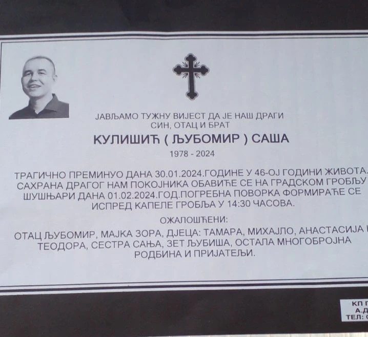 Svirepo ubijeni Saša Kulišić biće sahranjen sutra, 1. februara na dobojskom groblju Šušnjari.