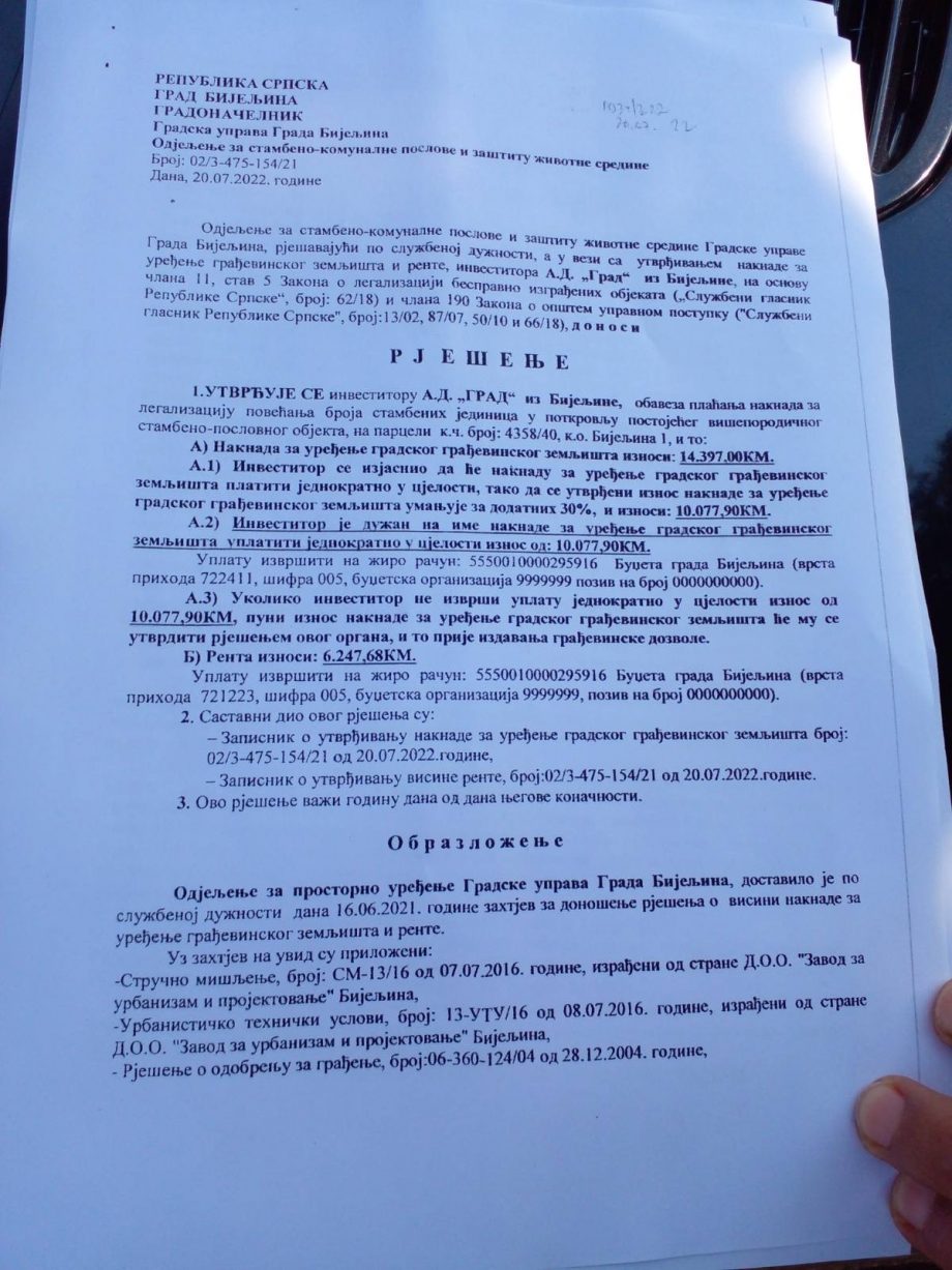 Stanari su nam pokazali rješenja u kojima decidno stoji da je investitor trebalo svojevremeno da uplati oko 17.000 KM na ime nadoknade za legalizaciju povećanja broja stambenih jedinica u potkrovlju objekta, za nadoknadu za uređenje građevinskog zemljišta, kao i za građevinsku rentu.