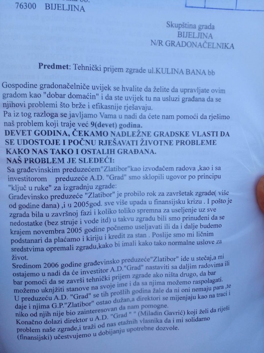 “Ovdje živi oko devedeset odsto onih koji su tokom rata izbjegli s područja FBiH. U bescijenje su prodali svoju imovinu u FBiH, da bi ovdje obezbijedili bilo kakav krov nad glavom. Gradonačelnik nam je obećao da će Gradska uprava pomoći, a pomoć je obećao i “Grad” A.D. Mi, stanari, spremni smo da izdvojimo dio sredstava da se konačno legalizuje ovaj objekat, odnosno da se izvrši tehnički prijem zgrade i da se stanarima omogući etažiranje stanova.