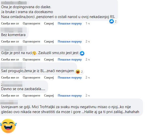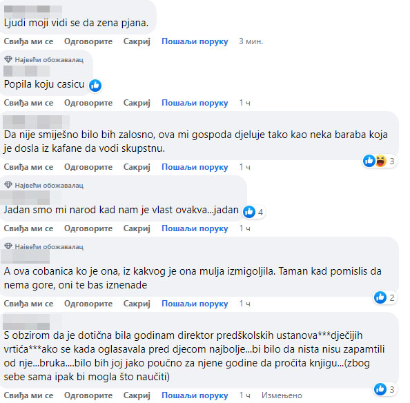 “Onaj ko je dozvolio da ovakva osoba predsjedava je gori dikonja od nje. Kad sam je čula samo sam čekala da odnekud se i Zmaj pojavi jer više ništa ne može iznenaditi; Ovo je rijaliti veći od svih”; Nema komentara, pobjednica nekulture, neukusa, nevaspitanja, neznanja i još mnogo ne, ne, ne……..,” komentari su građana koji su pratili sjednicu.