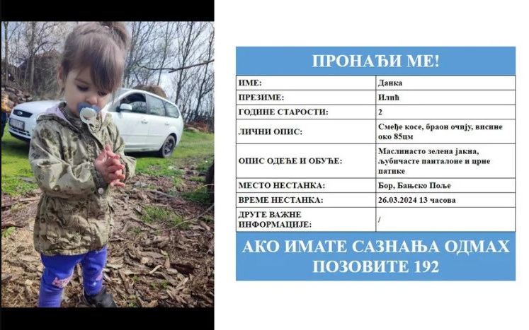 Dvogodišnja Danka Ilić nestala je u utorak oko 13.45 časova, a u trenutku nestanka na sebi je imala ljubičaste pantalone, maslinasto zelenu jaknu i kosu vezanu u rep.