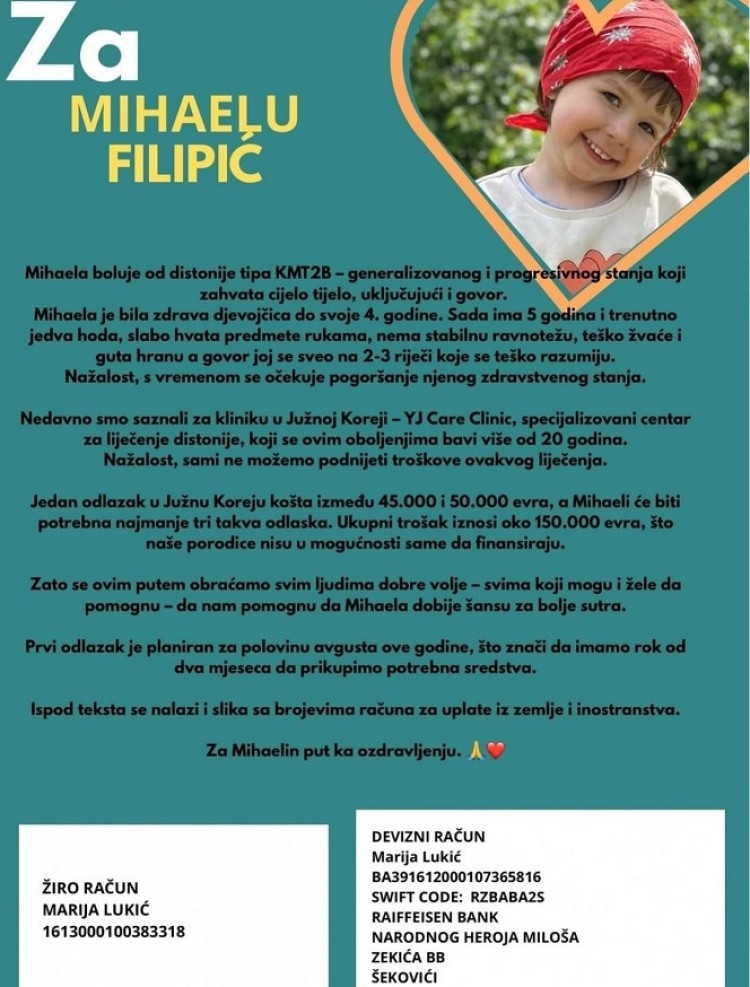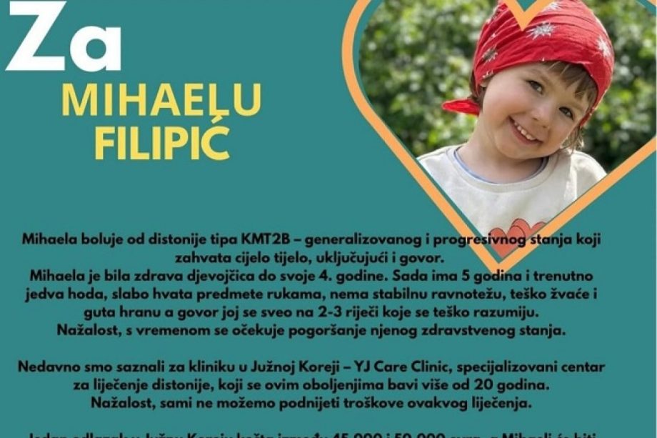 “Bila je zdrava djevojčica do svoje četvrte godine. Sada jedva hoda, slabo hvata predmete rukama, nema stabilnu ravnotežu, teško žvaće i guta hranu, a govor joj se sveo na dvije do tri, teško razumljive, riječi. Nakon godinu dana borbe, porodica je iscrpila sve mogućnosti liječenja Mihaeline bolesti na našim prostorima, a s vremenom se kažu, nažalost, očekuje pogoršanje njenog zdravstvenog stanja. Sad pomoć moraju tražiti u Južnoj Koreji na YJ Care Clinic – specijalizovani centar za liječenje distonije koji se ovim oboljenjima bavi više od 20 godina”.