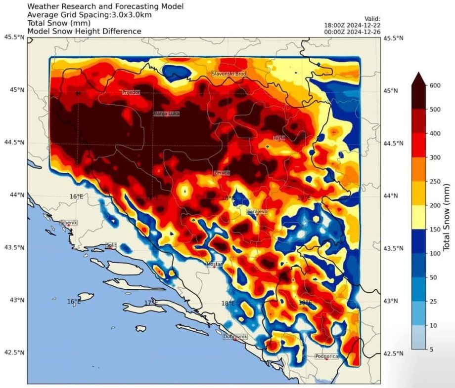 “Centralni dijelovi Bosne, uključujući Zenicu, Sarajevo i okolne planine, nalaze se u samom centru crvene zone, sa snježnim padavinama koje premašuju 1 metar. Iako Hercegovina neće zabilježiti intenzivne padavine na nižim nadmorskim visinama, najviši vrhovi Prenja i Čvrsnice takođe će akumulirati značajne količine snijega”.