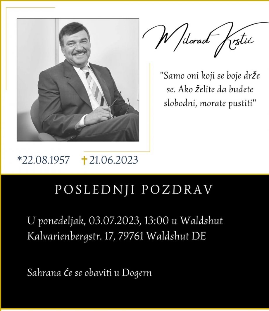 Ovim putem informišemo širu javnost da ća sahrana gospodina Krstića biti održana u ponedeljak, 03.07.2023. u 13 časova u Waldshut Kalvarienberstr. 17, 79761 Waldshut DE u Dogernu.