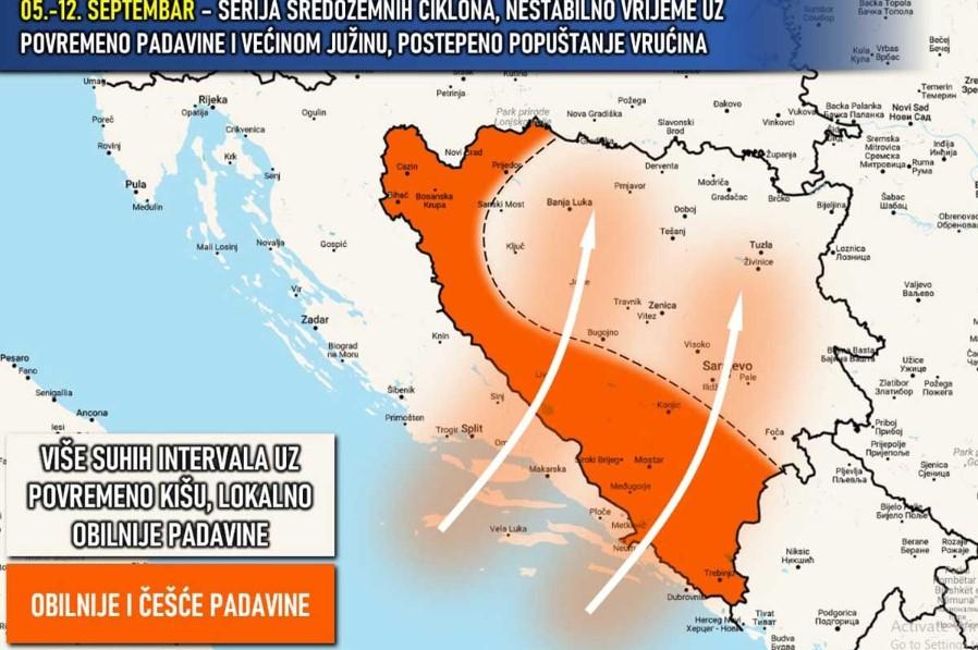 “Od prijepodnevnih sati će sa zapada dolaziti do postepenog naoblačenja u cijeloj zemlji. Uz pretežno oblačno vrijeme tokom dana u većem dijelu zemlje je moguće da bude prolazno malo kiše ili lokalno pljuskova sa grmljavinom”, navodi se na stranici BHmeteo.ba.