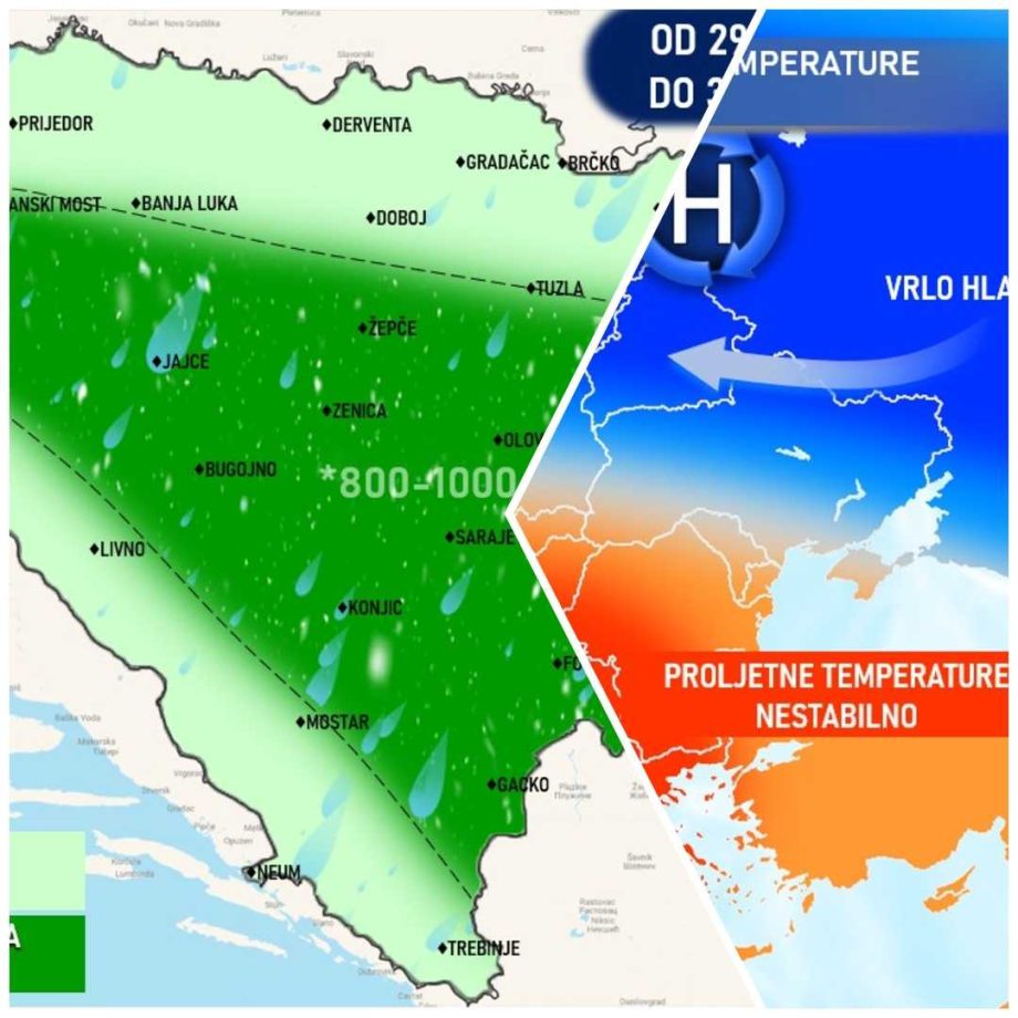 Od večeras pa do petka naveče (30. januara) u dijelovima centralne, istočne i jugoistočne Bosne, kao i na sjeveru Hercegovine, očekuje se pretežno oblačno vrijeme uz slabe do lokalno umjerene padavine. U nižim krajevima padaće kiša, dok će na nadmorskim visinama iznad 800 metara biti susnježice i snijega. Na planinama se lokalno očekuje od 5 do 10 centimetara novog snijega, prognozira BH Meteo.