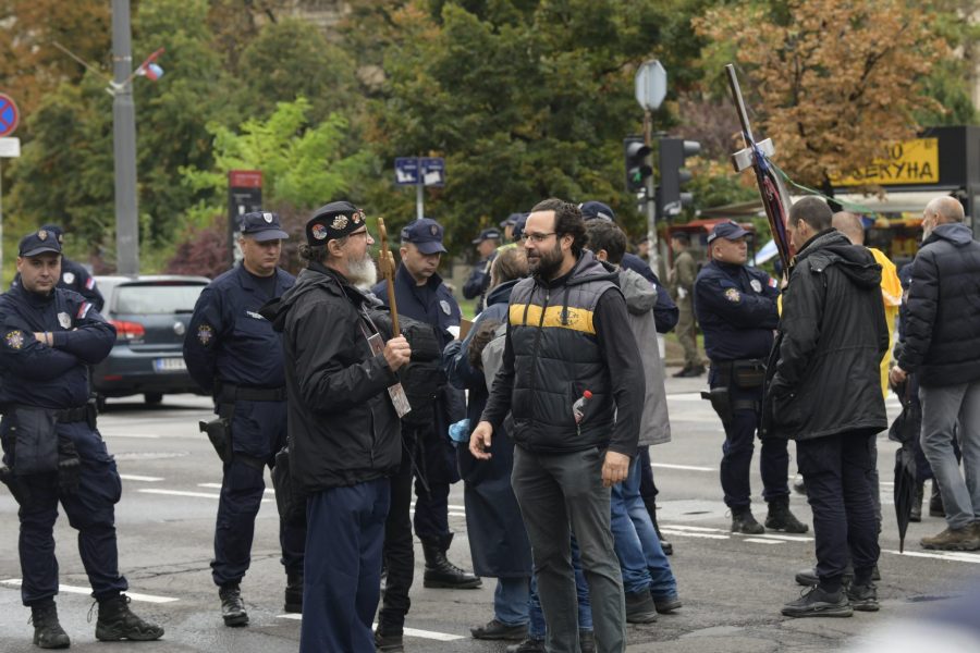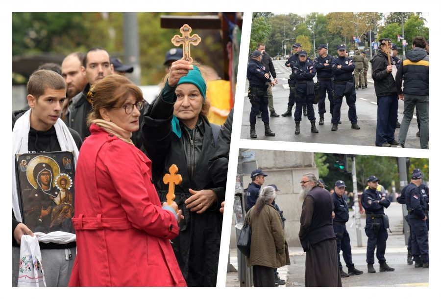 Desetak ljudi nalazi se na raskrsnici Bulevara Kralja Aleksandra i Beogradske ulice, kod Pravnog fakulteta, i takođe nose ikone i krstove.