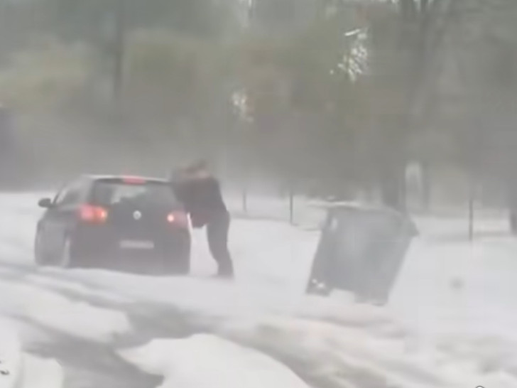 Grad je prekrio puteve, a o količini koja je pala govori i podatak da su automobili ostali zaglavljeni na putu. Na snimku se vidi grupa momaka koja, kao u vrijeme najvećeg snijega, gura automobil.