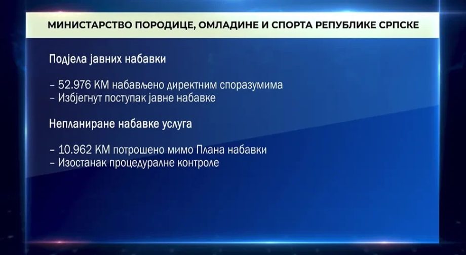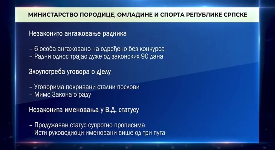 Ministarstvo porodice, omladine i sporta Republike Srpske poslovalo je s brojnim nepravilnostima, a u pojedinim slučajevima bilo je i kršenja zakona.