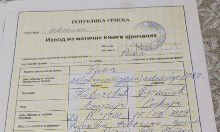 Prisjećajući se davno prošlih vremena i mladalačkih dana, Kovačevići se i danas, posle 73 godine bračnog života, sjećaju tog Aranđelovdana 1949. godine kada su se jedno drugom zakleli na vječnu ljubav i u dobru i u zlu. Vjenčanje je obavljeno u opštini pred matičarem, ali je Andrija, iako komunista i učesnik u Drugom svetskom ratu, pristao da svojoj ljubavi ispuni želju i da poslije građanske ceremonije, sveštenik očita očenaš.
