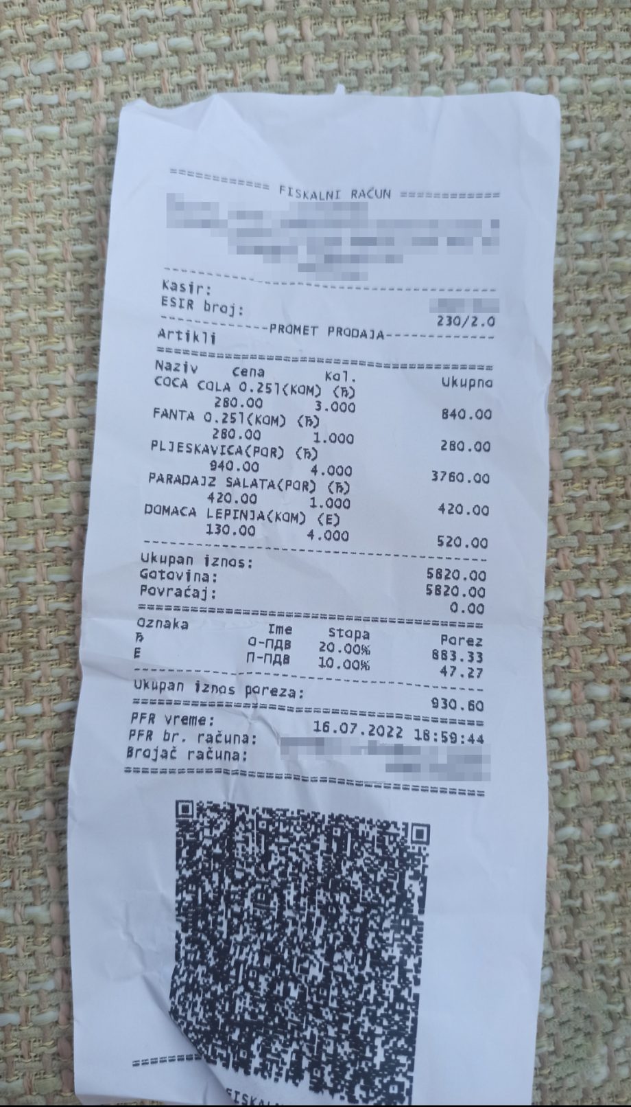 Na računu koji nam je poslao čitalac navedeno je da koka-kola i fanta koštaju 280 dinara, ali ono što najviše iznenađuje je cijena pljeskavice koja iznosi čak 940 dinara. Porcija paradajz salate je 420 dok je domaća lepinja 130 dinara. Pa, svaka čast!