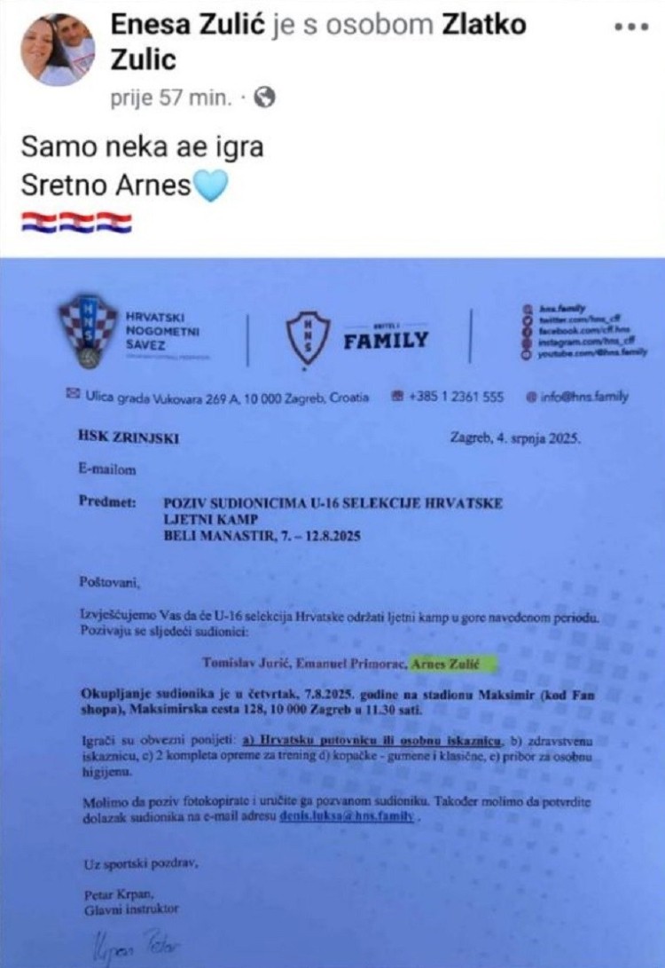 Poziv na Facebooku objavila je igračeva majka Enesa uz status “Samo neka se igra. Sretno Arnes” i hrvatske zastave.
