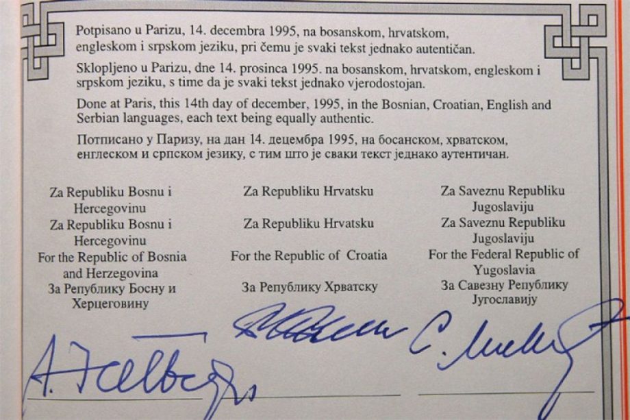 Dejtonski sporazum zvanično je potpisan 14. decembra 1995. godine u Jelisejskoj palati u Parizu.