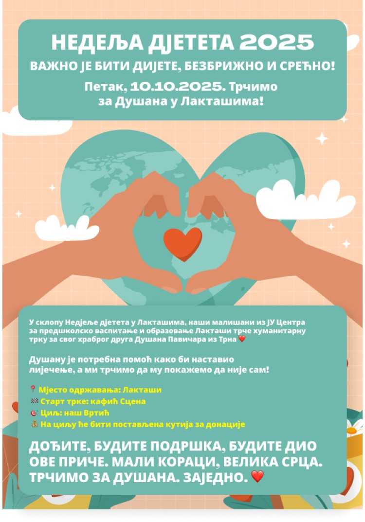 Takođe, za Dušana će u Laktašima u petak 10. oktobra biti održana i humanitarna trka u okviru Nedjelje djetata.