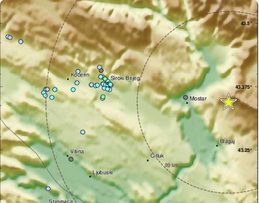 Epicentar je bio 9 kilometara sjeveroistočno od Mostara.