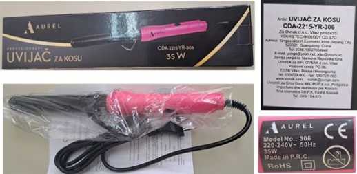 Riječ je o uvijaču za kosu marke „Aurel“ porijeklom iz Kine, kod kojeg je utvrđeno da napojni kabl nema propisanu debljinu provodnika, ulazna snaga nije u dozvoljenim granicama, a uređaj nije usklađen sa važećim propisima i standardima.
