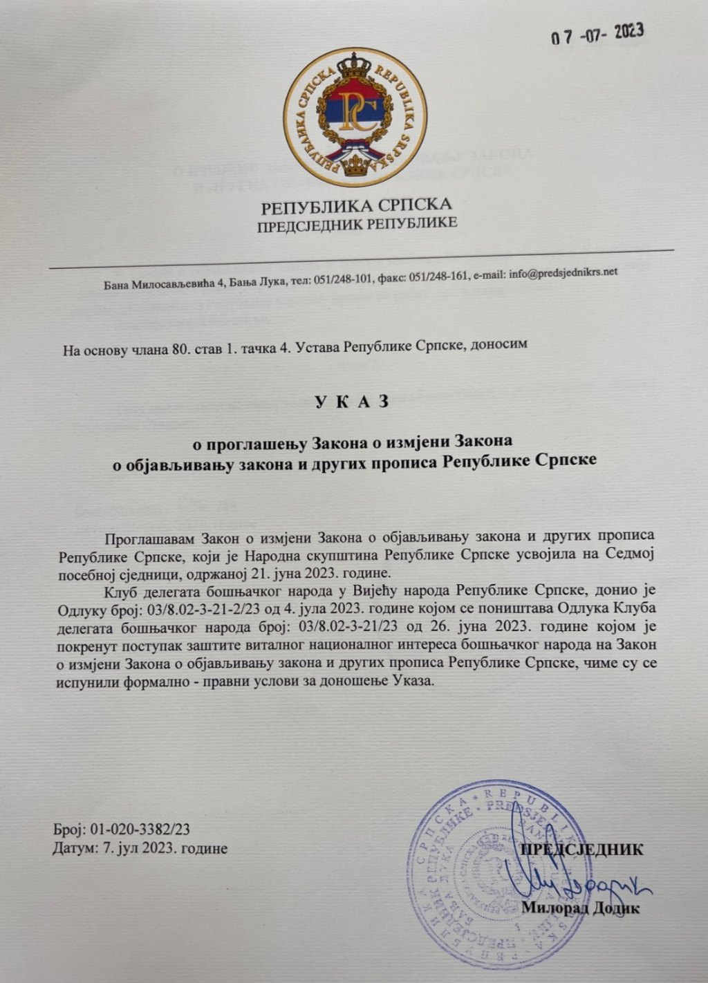 Novoizabrani vršilac dužnosti direktora Službenog glasnika Miloš Lukić potpisao je jutros odluke o objavljivanju Ukaza predsjednika Republike Srpske Milorada Dodika o proglašenju zakona da se odluke Visokog predstavnika ne objavljuju u Službenom glasniku i da se odluke Ustavnog suda ne primjenjuju na teritoriji Srpske.