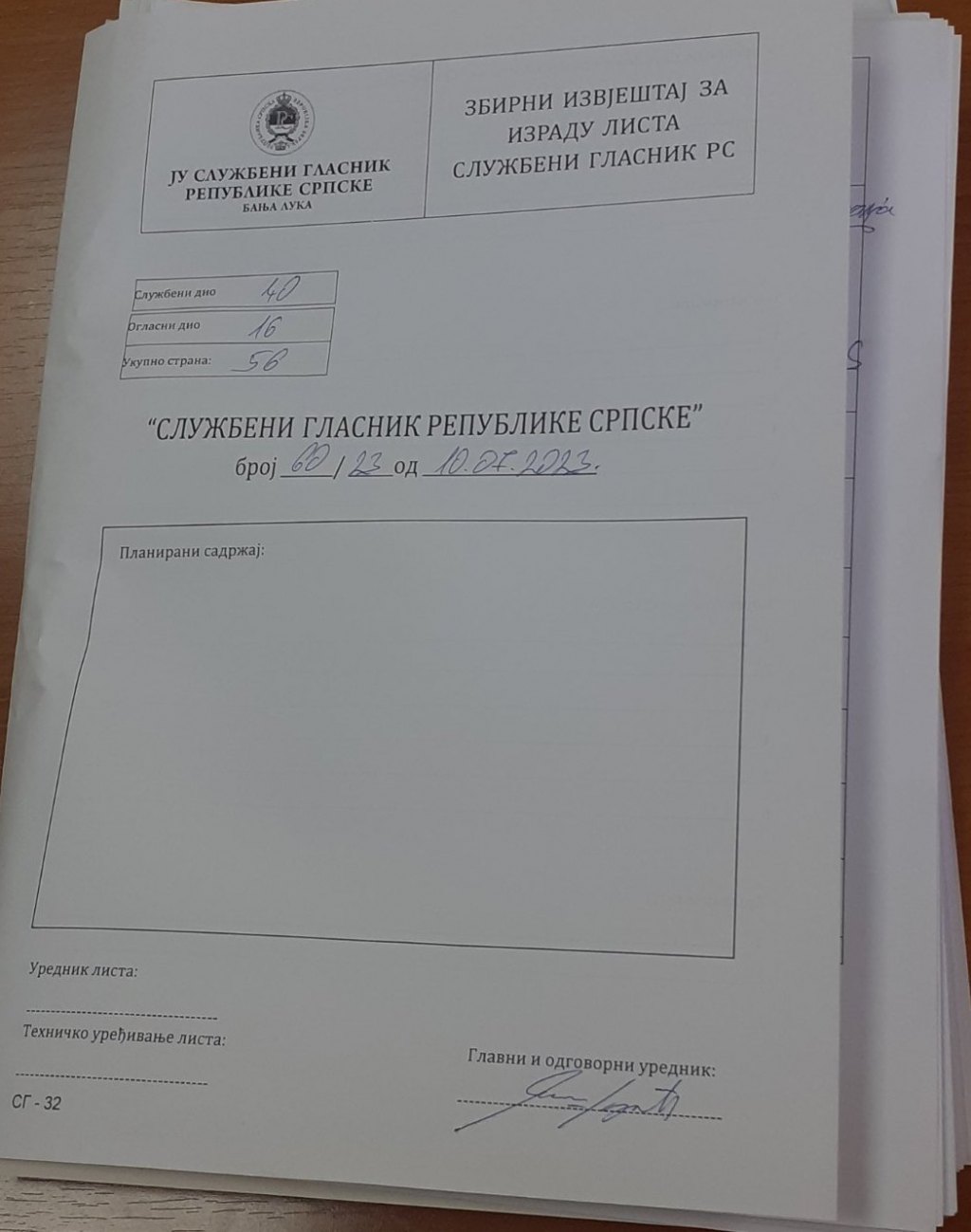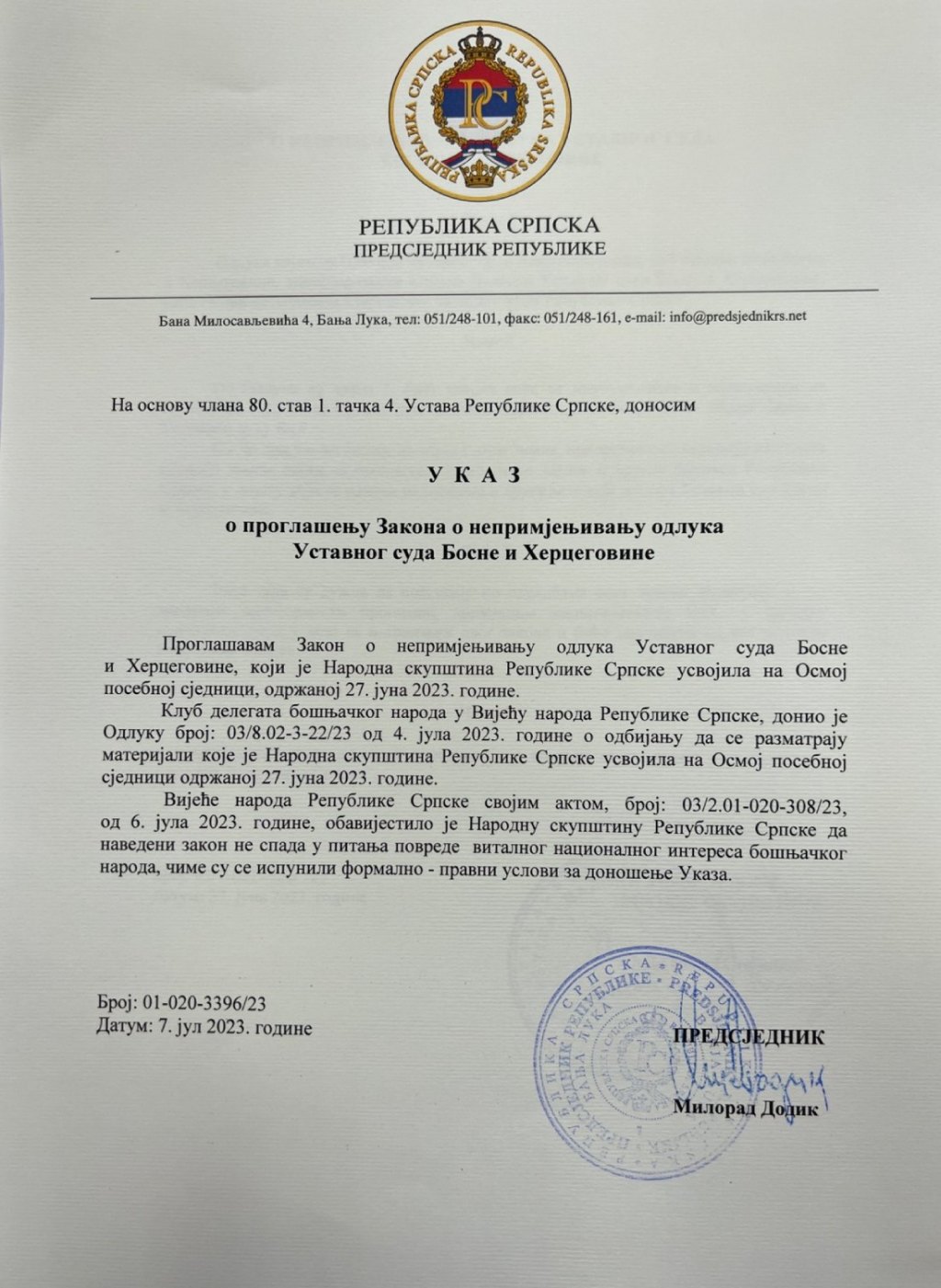 Novoizabrani vršilac dužnosti direktora Službenog glasnika Miloš Lukić potpisao je jutros odluke o objavljivanju Ukaza predsjednika Republike Srpske Milorada Dodika o proglašenju zakona da se odluke Visokog predstavnika ne objavljuju u Službenom glasniku i da se odluke Ustavnog suda ne primjenjuju na teritoriji Srpske.