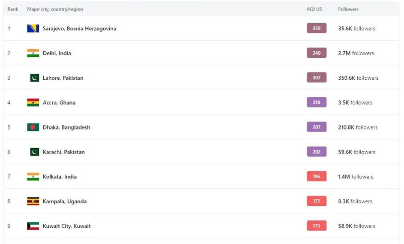 Iza Sarajeva jutros su bili Delhi, Lahore, Akra, Daka, Karači, Kolkata, Kampala, Kuvajt Siti i Kabul. Međutim, Sarajevo i Delhi se smjenjuju na prvom po mjestu, prema indeksu zagađenja.