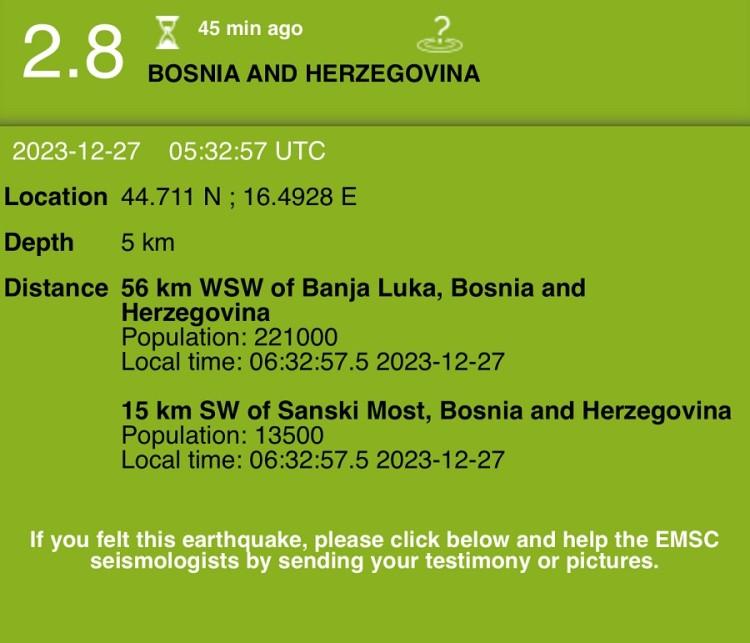 Kraći zemljotres magnitude 2.8 zabilježen je jutros u 06.32 sati u Bosni i Hercegovini, kraj Banjaluke, ali se osjetio i u Hrvatskoj.